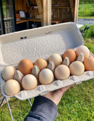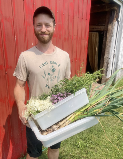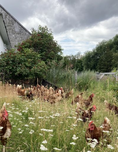 Roch le fermier est une microferme démarrée en 2021 sur un lopin de 6 acres. Inspirée par l’agroécologie et l’agroforesterie, les parcelles potagères et les pâturages des volailles fermières sont entourés de haies brises-vent nourricières. Un jeune verger diversifié grandit tranquillement : la vision est d’en faire un verger pâturé.
