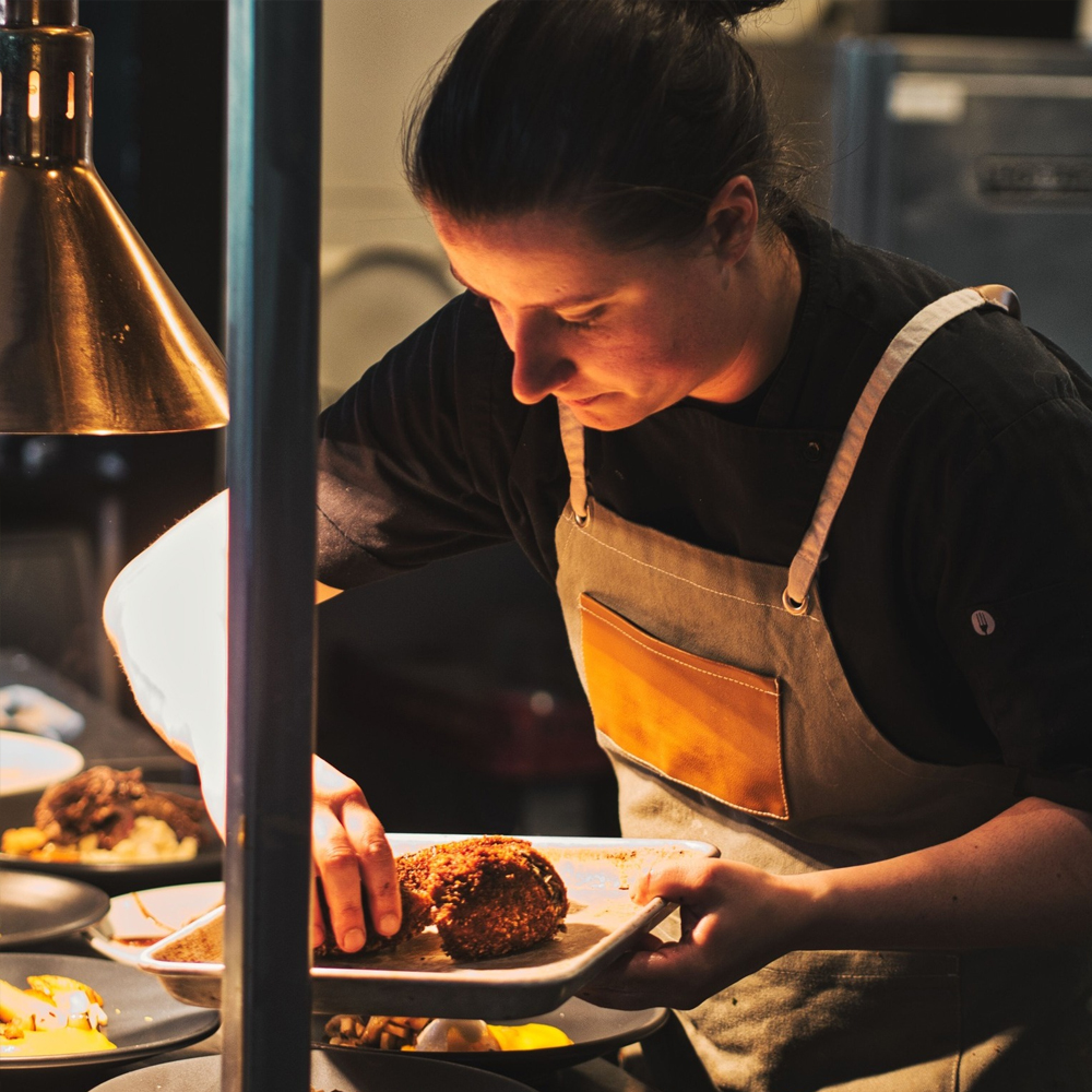 La cheffe Chloé Ouellet propose une cuisine 100% locale axée sur les légumes où l’approvisionnement se fait en grande partie à même les champs et la serre d’Au Pâturage. Pendant la belle saison, elle invite d’ailleurs ses convives à visiter ses installations avant de s’attabler pour un généreux souper gastronomique ou pour le toujours très populaire brunch du dimanche. L’abondance estivale est ensuite conservée pour pouvoir être dégustée à l’année, et ce, avec beaucoup de créativité.