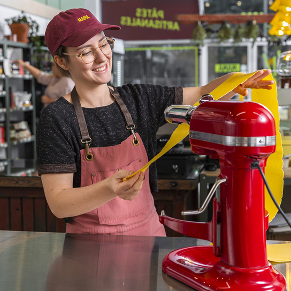 Marie-Florence, maman de deux enfants et passionnée d'alimentation locale, est la cheffe-propriétaire de l'Épicerie MAMA. Diplômée en Gestion Hôtelière au Collège Laflèche et en Cuisine professionnelle à l'ITHQ, elle a plus d'une douzaine années d'expérience dans les cuisines de restaurants, dont trois années à faire des pâtes fraiches. Son commerce est un petit établissement à Trois-Rivières où la nourriture locale et de qualité règne, sous forme de comptoir de pâtes fraiches et d'épicerie fine. Elle met en valeur une variété de producteurs d'ici, en plus d'offrir ses pâtes faites de semoule biologique et locale et farcies d'aliments locaux. Elle a comme objectif de promouvoir nos beaux produits du Québec de qualité, en transformant sur place les aliments.