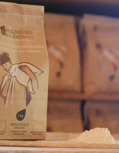 Troisième construction au même emplacement, l’actuel moulin des Aulnaies (1842) transforme encore le grain avec un mécanisme du XIXe siècle. La Seigneurie des Aulnaies offre une gamme de 10 types de farines bio (certifiées ECOCERT). Durant l’été, c’est la force de l’eau qui actionne la grande roue à godets du moulin pour une production sans empreinte écologique. Au moulin, assistez au fascinant spectacle de la plus grande roue à godets en activité au Québec. Sur trois étages, nos meunier. ères font la démonstration de toutes les étapes de l’ingénieuse fabrication de la farine, comme au XIXe siècle. La meule de pierre écrase le grain, le bluteau sépare le son, l’amande et le germe dans un vacarme impressionnant. Laissez le meunier Steve Beaulieu partager sa passion avec vous!