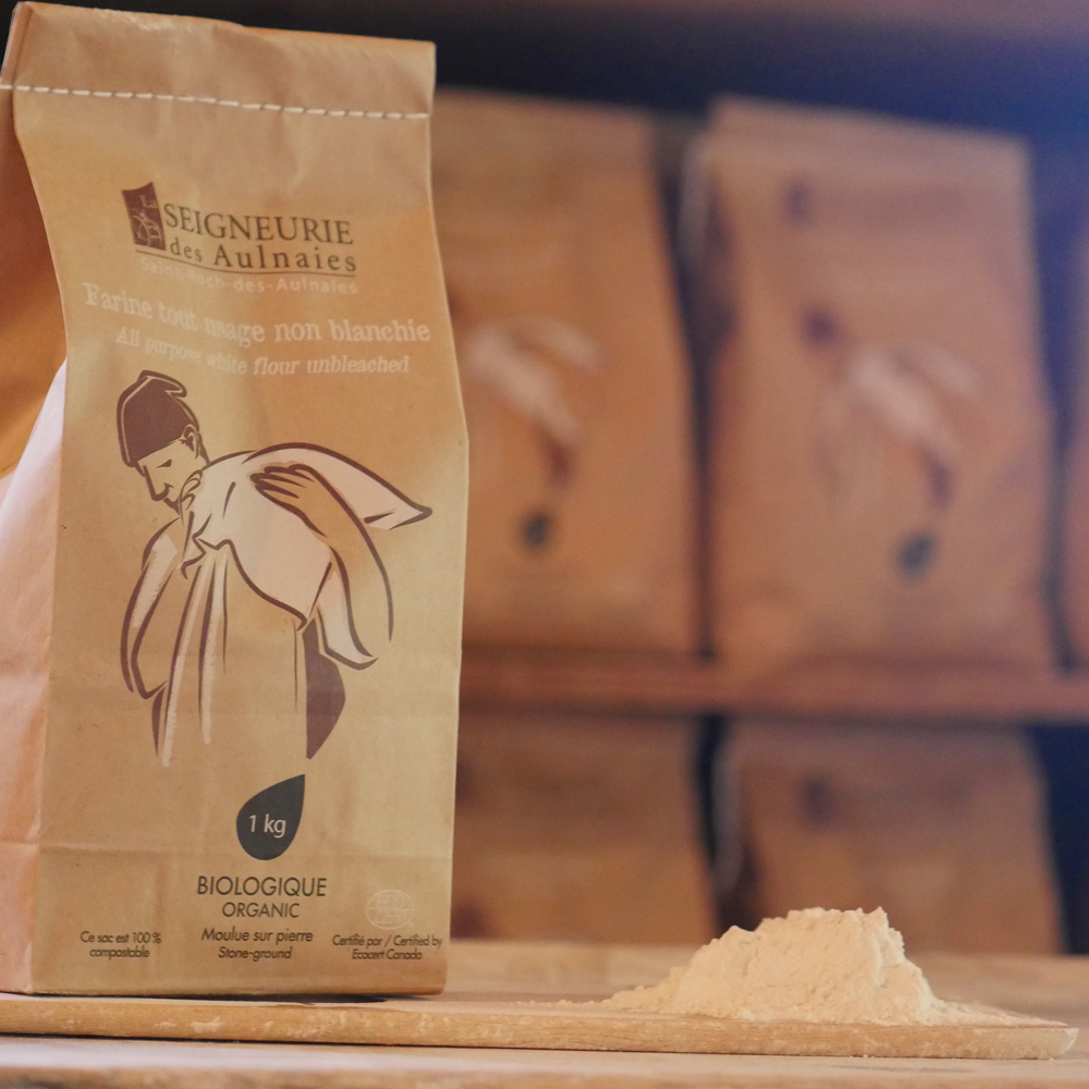 Troisième construction au même emplacement, l’actuel moulin des Aulnaies (1842) transforme encore le grain avec un mécanisme du XIXe siècle. La Seigneurie des Aulnaies offre une gamme de 10 types de farines bio (certifiées ECOCERT). Durant l’été, c’est la force de l’eau qui actionne la grande roue à godets du moulin pour une production sans empreinte écologique. Au moulin, assistez au fascinant spectacle de la plus grande roue à godets en activité au Québec. Sur trois étages, nos meunier. ères font la démonstration de toutes les étapes de l’ingénieuse fabrication de la farine, comme au XIXe siècle. La meule de pierre écrase le grain, le bluteau sépare le son, l’amande et le germe dans un vacarme impressionnant. Laissez le meunier Steve Beaulieu partager sa passion avec vous!