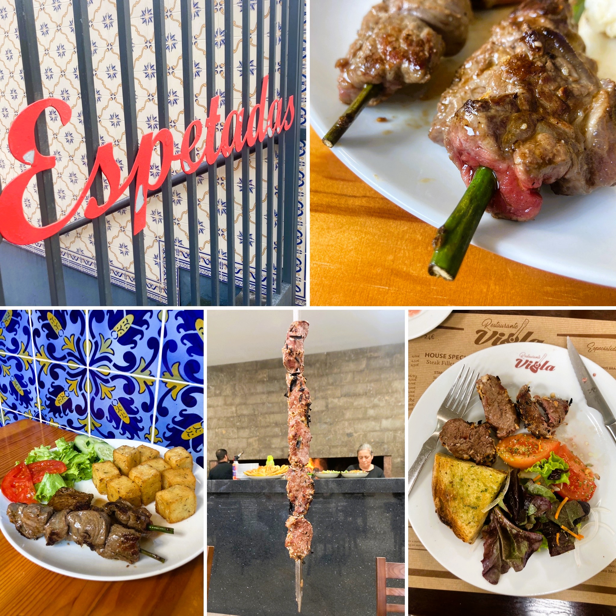 Les espedatas sont des brochettes de viande marinées à l’ail et au laurier et traditionnellement cuites sur feu de bois. Dans plusieurs restaurants à la carte variée, elles seront servie en assiette avec différents accompagnements. D’autres établissements spécialisés dans les espedatas les servent suspendues à la verticale et on commande des accompagnements à côté parmi les choix de salade, pommes de terre, frites, milho frito (cubes de polenta frite), etc. Dans ces restos, les tables sont parfois d’emblée équipée d’un haut crochet servant à suspendre les brochettes choisies.