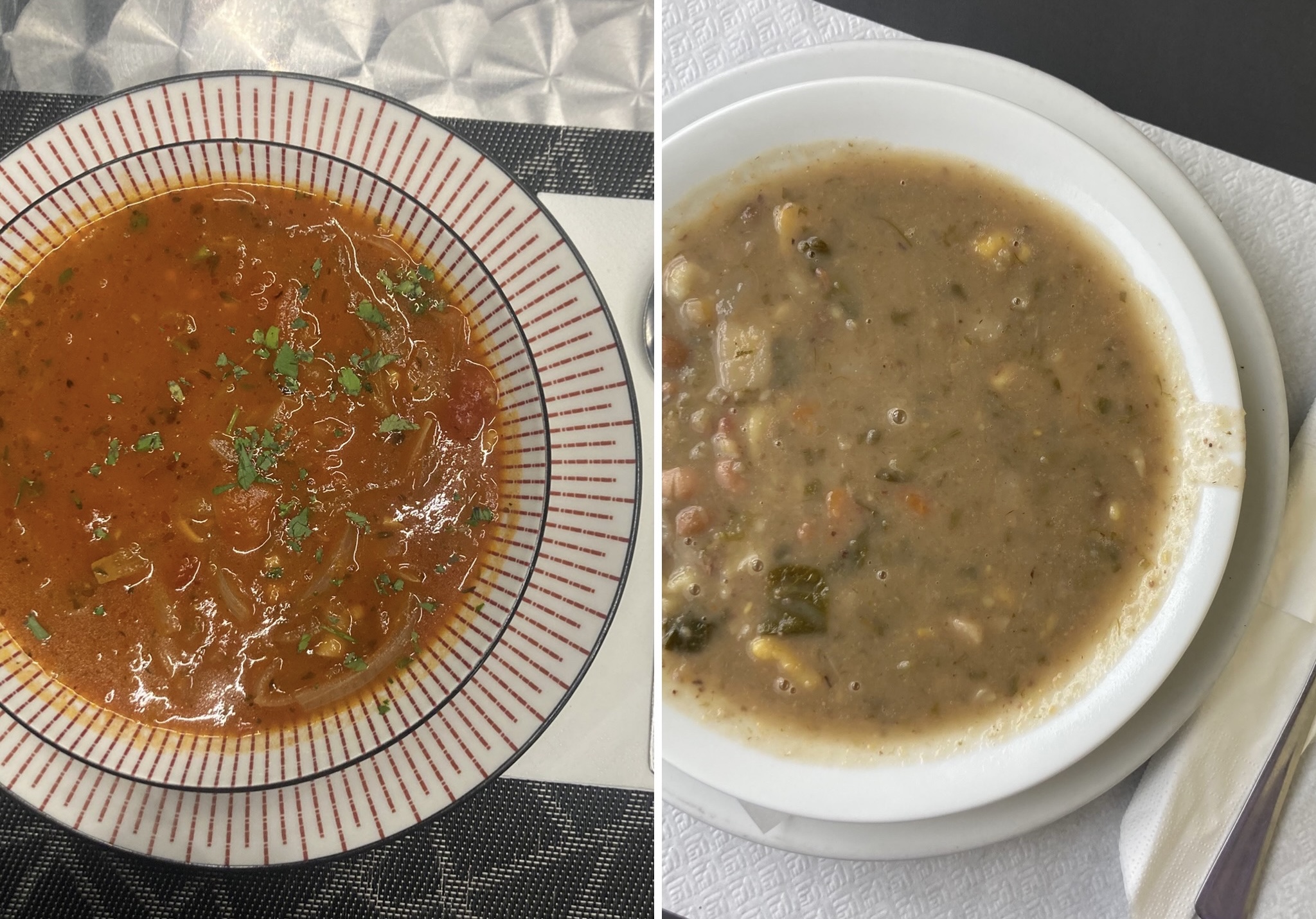 Les cuisines paysannes ont souvent des soupes typiques, et Madère ne fait pas exception. Certaines journées plus fraîches de décembre étaient parfaites pour la randonnée, et toutes indiquées pour se réconforter avec une bonne soupe à l’arrivée. Les soupes vont être tantôt à la patate douce (très cultivée ici), tantôt aux légumineuses, tantôt au chou feuillu (que vous verrez le long de vos randonnées) et autres légumes des récoltes du moment. Certaines soupes sont assez typiques : la soupe de tomates et d’oignon (avec ou sans oeuf poché), la soupe de trigo (grains de blé et légumes), et la soupe de châtaignes (typique de Curral das Freiras, reconnue pour sa châtaigne, qu’on trouve partout au menu spécialement l’automne). J’ai mangé la mienne sur la terrasse de La Perla, mention spéciale pour la vue exceptionnelle!).