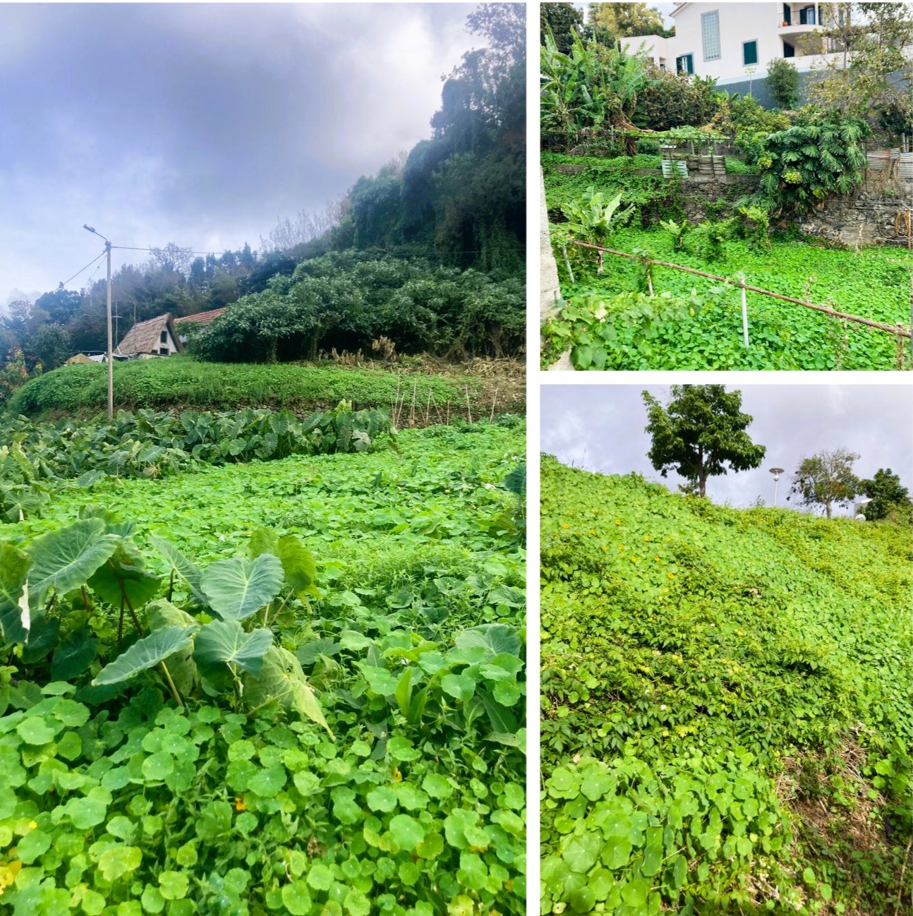 Entre les maisons paysannes, quand il y a de petites friches, il est très fréquent de les voir envahies de capucines. Ça m’a impressionnée, moi qui en fait pousse un beau rang bien sage dans mon potager chaque été, de les voir « ensauvagées » de la sorte. Véritable couvre-sol, on les croise partout…. sauf peut-être dans les assiettes. Du moins, en deux semaines de repas à la madérienne, je n’ai pas eu conscience de plats qui les utilisaient, ce qui m’a surprise puisque l’abondance est bien réelle.