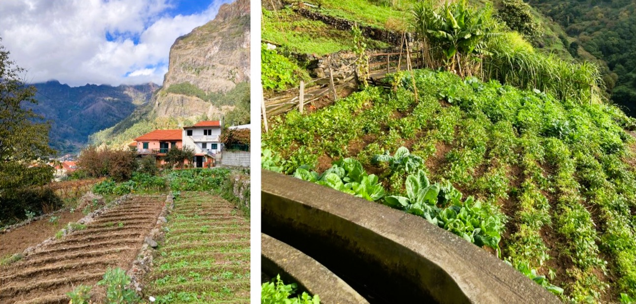 Puis, les levadas sortent des cœurs villageois et se poursuivent dans des paysages ruraux. Ce ne sont plus quelques bananiers ou une poignée de plants de choux, mais des petites bananeraies, des rangs de choux, des parcelles de patates douces, des vignobles, des pâturages pour quelques animaux. À Madère, territoire tout en pentes, pas de place pour les grandes monocultures. L’agriculture se fait essentiellement en terrasses, pour arracher aux montagnes quelques morceaux de terre à cultiver.
